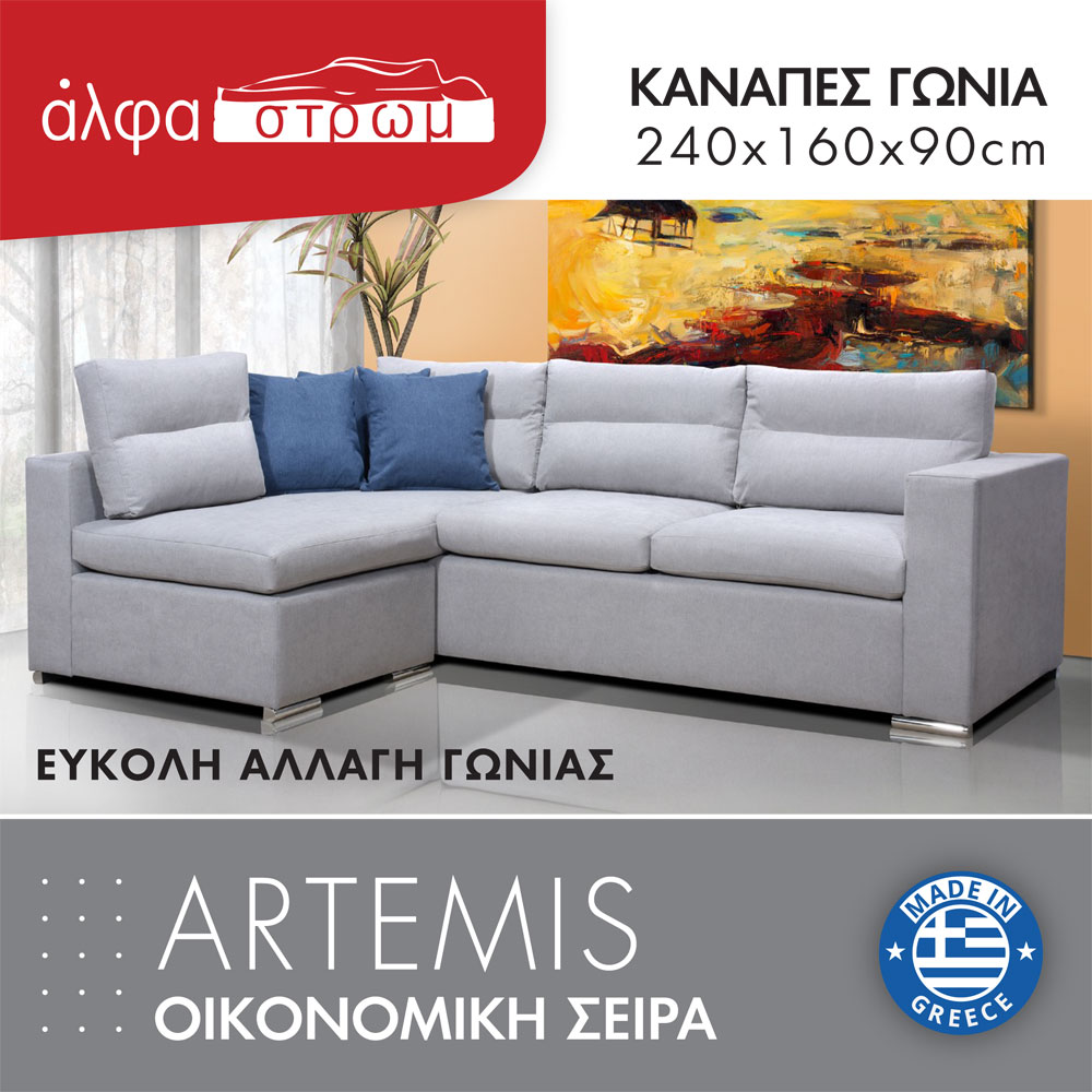 Ένας οικονομικός γωνιακός καναπές με δυνατότητα ελεύθερης τοποθέτησης της γωνίας αριστερά ή δεξιά, εύκολα και γρήγορα με απλή μετακίνηση του ταμπουρέ. Είναι ελληνικής κατασκευής και επιλέγετε τα υφάσματα της αρεσκείας σας καθώς και το χρώμα των ποδιών. Τα χρώματα των υφασμάτων μπορεί να διαφέρουν ελαφρώς από την εικόνα. Υπάρχει η δυνατότητα να γίνει σε άλλες διαστάσεις με έξτρα χρέωση (επικοινωνήστε μαζί μας για τέτοια παραγγελία).