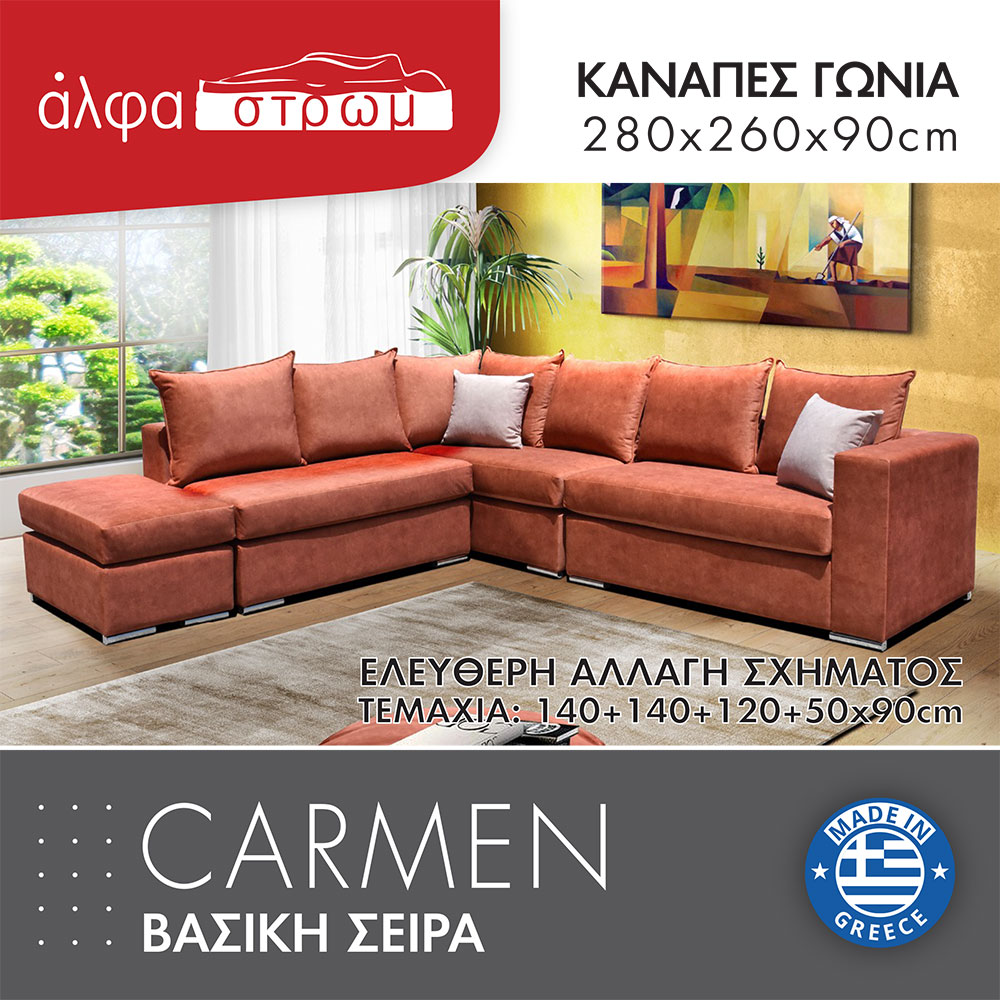 Σύστημα καναπέ αποτελούμενο από 4 κομμάτια, με δυνατότητα ελεύθερης τοποθέτησης της γωνίας αριστερά ή δεξιά, εύκολα και γρήγορα με απλή μετακίνηση των κομματιών και κρυφές ενώσεις (από κάτω). Είναι ελληνικής κατασκευής και επιλέγετε τα υφάσματα της αρεσκείας σας καθώς και το χρώμα των ποδιών. Τα χρώματα των υφασμάτων μπορεί να διαφέρουν ελαφρώς από την εικόνα. Υπάρχει η δυνατότητα να γίνει σε άλλες διαστάσεις με έξτρα χρέωση (επικοινωνήστε μαζί μας για τέτοια παραγγελία).