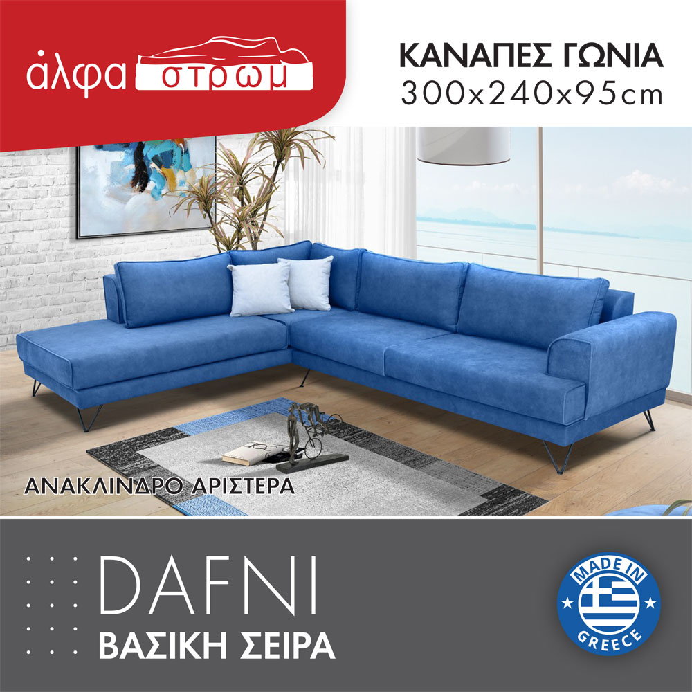 Ένας μοντέρνος γωνιακός καναπές με καμπύλες στην πλάτη, καμπυλωμένο μπράτσο και διακοσμητικά ρέλια. Επιλέγετε εξαρχής πού επιθυμείτε να είναι το ανάκλινδρο (αριστερά ή δεξιά - όπως φαίνεται στις φωτογραφίες). Είναι ελληνικής κατασκευής και επιλέγετε τα υφάσματα της αρεσκείας σας καθώς και το χρώμα των ποδιών. Τα χρώματα των υφασμάτων μπορεί να διαφέρουν ελαφρώς από την εικόνα. Υπάρχει η δυνατότητα να γίνει σε άλλες διαστάσεις με έξτρα χρέωση (επικοινωνήστε μαζί μας για τέτοια παραγγελία).