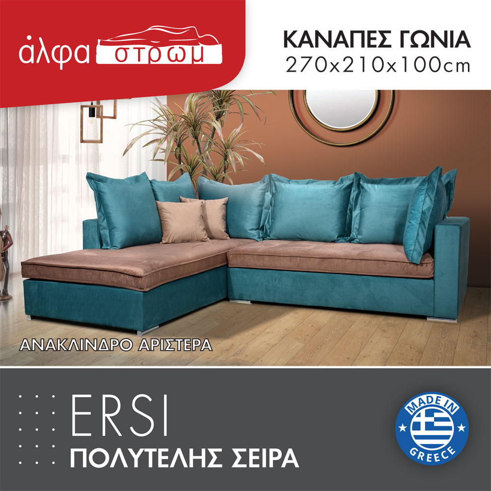 Ένας εντυπωσιακός γωνιακός καναπές με τραβήγματα στα μαξιλάρια καθίσματος και βολάν στα μαξιλάρια πλάτης. Επιλέγετε εξαρχής πού επιθυμείτε να είναι το ανάκλινδρο (αριστερά ή δεξιά - όπως φαίνεται στις φωτογραφίες). Είναι ελληνικής κατασκευής και επιλέγετε τα υφάσματα της αρεσκείας σας καθώς και το χρώμα των ποδιών. Τα χρώματα των υφασμάτων μπορεί να διαφέρουν ελαφρώς από την εικόνα. Υπάρχει η δυνατότητα να γίνει σε άλλες διαστάσεις με έξτρα χρέωση (επικοινωνήστε μαζί μας για τέτοια παραγγελία).