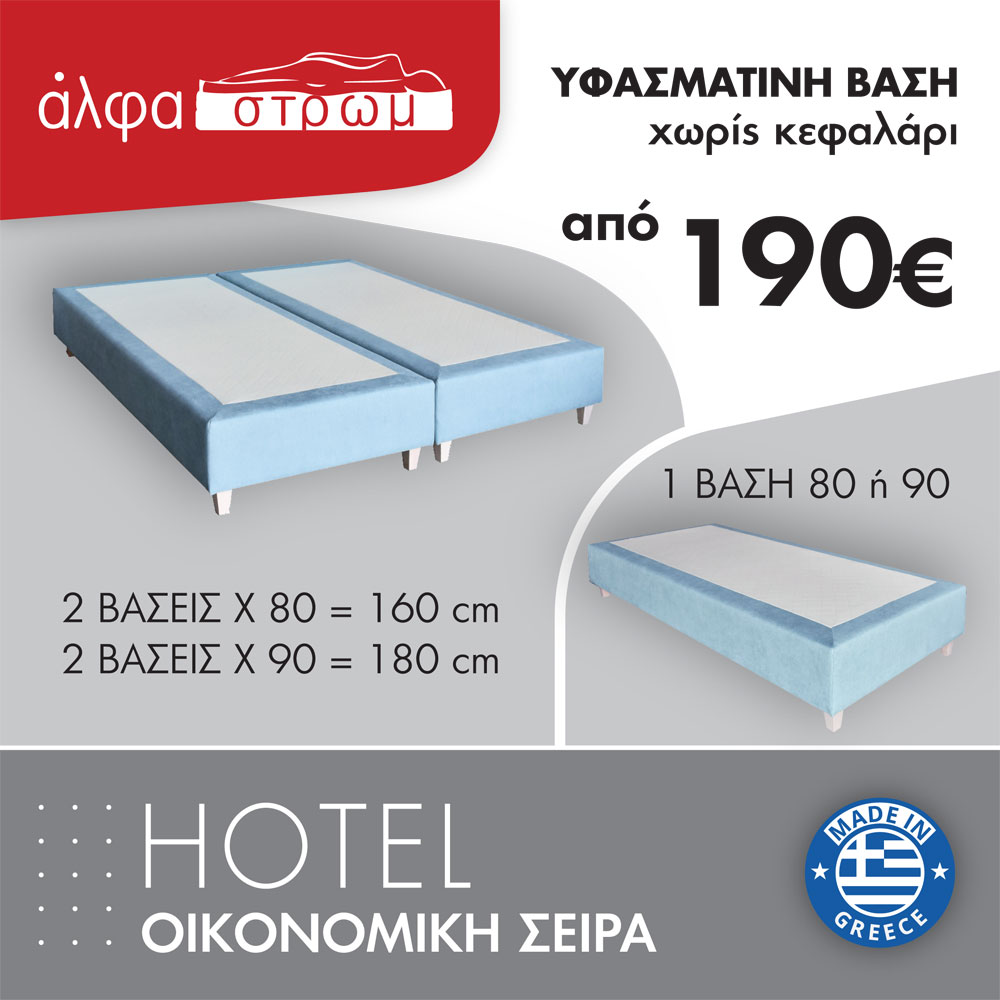 Μια υφασμάτινη βάση κρεβατιού χωρίς κεφαλάρι κατάλληλη για ξενοδοχεία ή και για χρήση στο σπίτι από ενήλικες και παιδιά. Είναι ελληνικής κατασκευής και επιλέγετε το ύφασμα της αρεσκείας σας. Τα χρώματα των υφασμάτων μπορεί να διαφέρουν ελαφρώς από την εικόνα. Επιλέγετε αν θα είναι μονή ή 2 βάσεις δίπλα-δίπλα που σχηματίζουν υπέρδιπλη διάσταση.