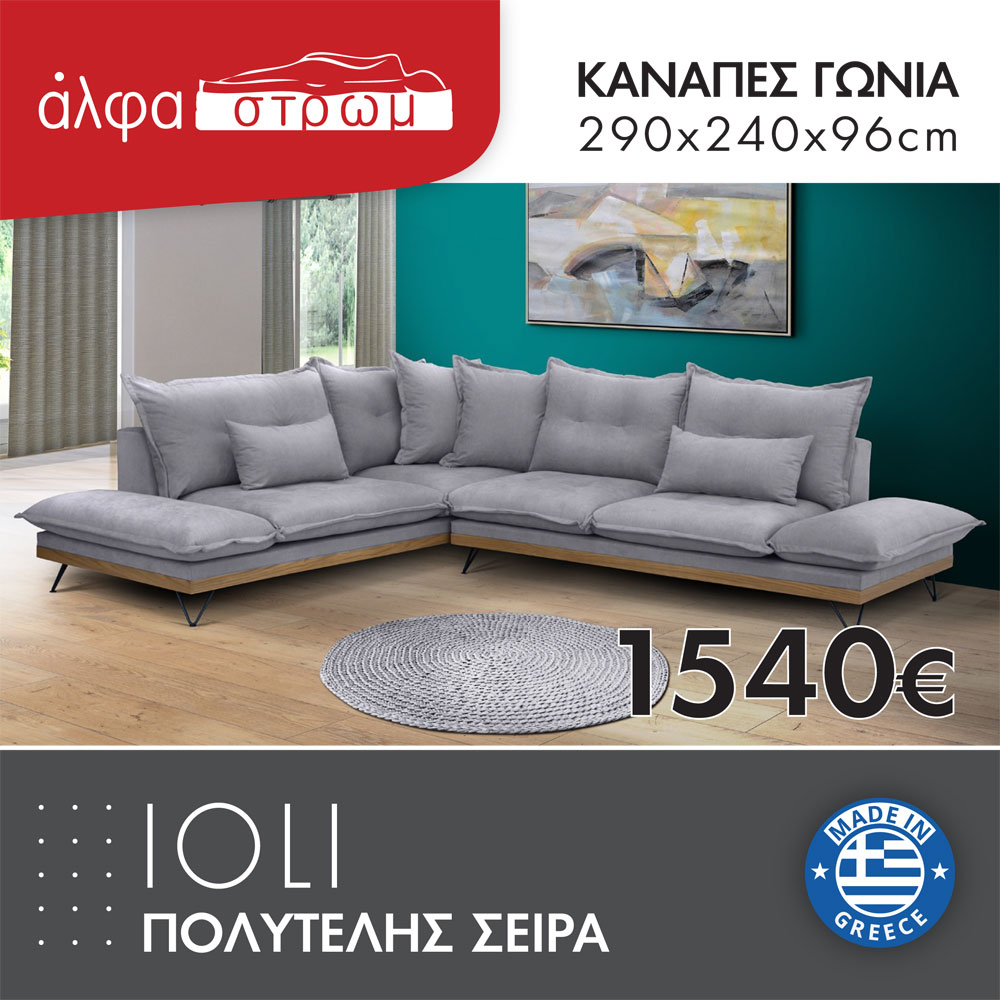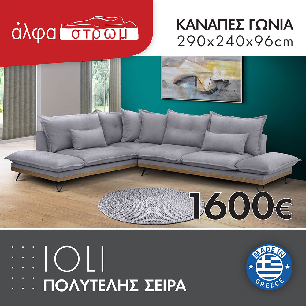 Γωνιακός καναπές σε μοντέρνο ύφος, με ξύλινα στοιχεία στη βάση, ανάκλιντρο και στις δυο πλευρές και μεταλλικά μαύρα πόδια. Όλα τα μαξιλάρια του φέρουν ιδιαίτερη ραφή με περιμετρικό βολάν και τραβήγματα. Το κάθισμα αποτελείται από πομπέ αφρολέξ για ένα πιο εντυπωσιακό αποτέλεσμα. Είναι ελληνικής κατασκευής και επιλέγετε τα υφάσματα της αρεσκείας σας καθώς και το χρώμα των ποδιών. Τα χρώματα των υφασμάτων μπορεί να διαφέρουν ελαφρώς από την εικόνα. Υπάρχει η δυνατότητα να γίνει σε άλλες διαστάσεις με έξτρα χρέωση (επικοινωνήστε μαζί μας για τέτοια παραγγελία).