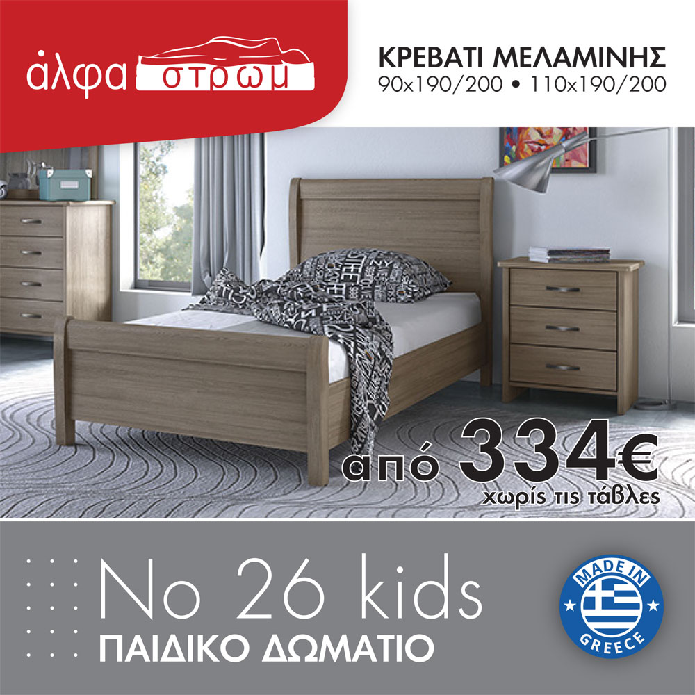 Ένα στιβαρό κρεβάτι μελαμίνης κατάλληλο για παιδιά (και ενήλικες). Είναι ελληνικής κατασκευής και βγαίνει μονόχρωμο. Τα χρώματα των ξύλων και των υφασμάτων μπορεί να διαφέρουν ελαφρώς από την εικόνα. Υπάρχει η δυνατότητα να γίνει κλειστό κουτί που "πατάει" στο πάτωμα (μπαούλο) με έξτρα χρέωση. Επίσης, γίνεται κατασκευή με αποθηκευτικό χώρο με χρήση ανατομικού τελάρου και μηχανισμού ανύψωσης, με έξτρα χρέωση.