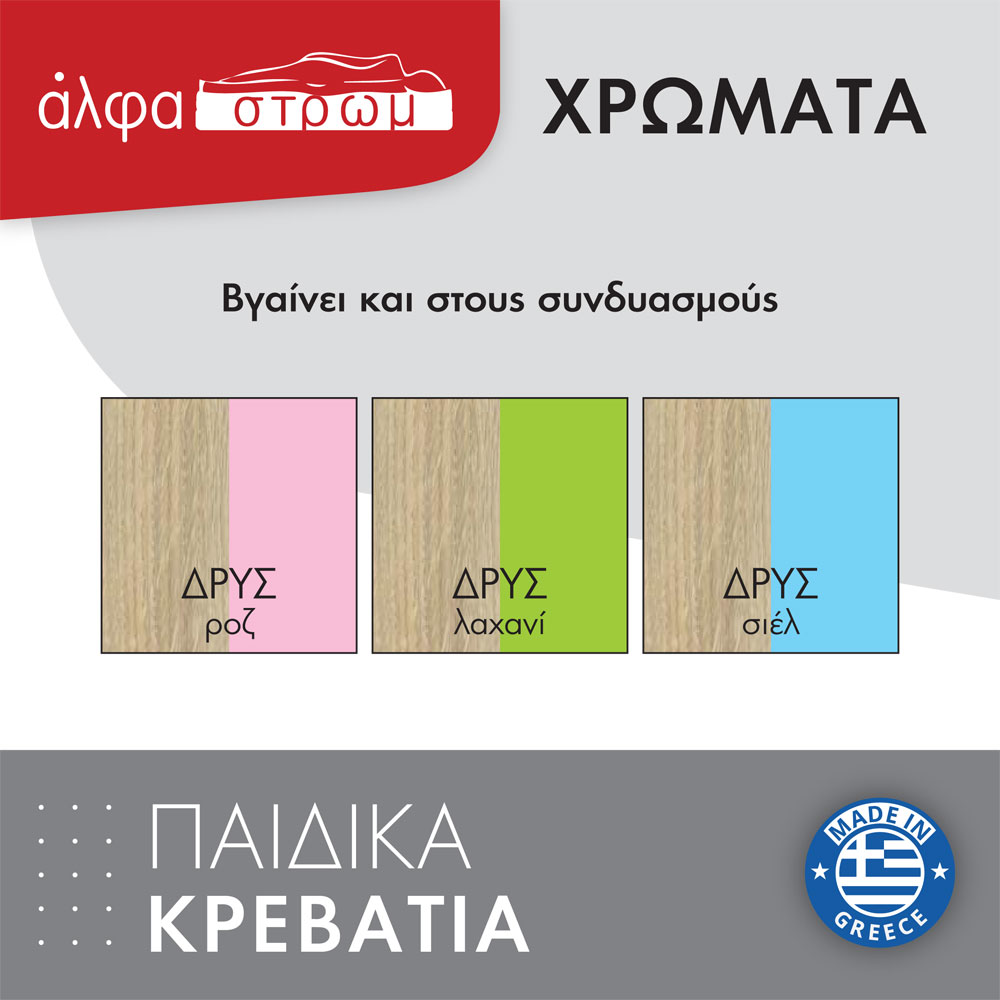 Ένα απλό και οικονομικό κρεβάτι μελαμίνης κατάλληλο για παιδιά (και ενήλικες). Είναι ελληνικής κατασκευής και βγαίνει μονόχρωμο ή σε συνδυασμό 2 χρωμάτων. Τα χρώματα των ξύλων και των υφασμάτων μπορεί να διαφέρουν ελαφρώς από την εικόνα.
