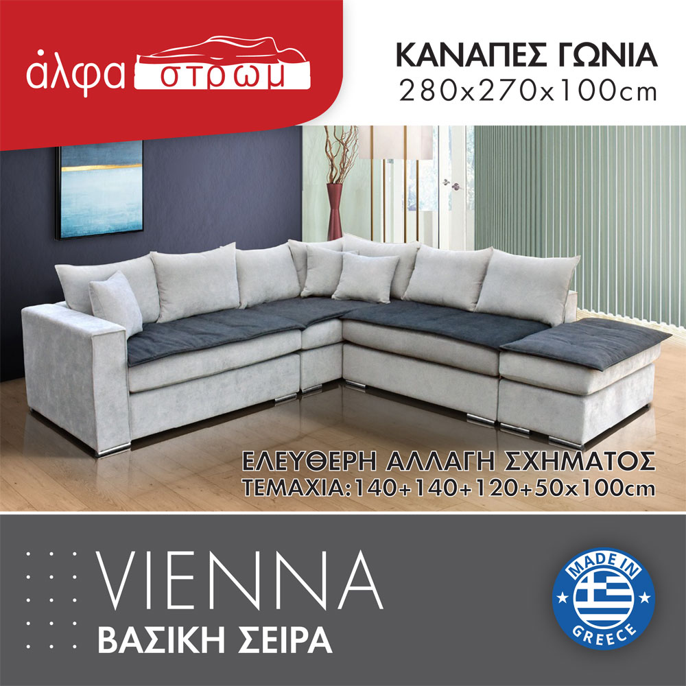 , με διακοσμητικό εξώραφο ρέλι και προστατευτικά ανωστρώματα/ καλύμματα. Δυνατότητα ελεύθερης τοποθέτησης της γωνίας αριστερά ή δεξιά, εύκολα και γρήγορα με απλή μετακίνηση των κομματιών και κρυφές ενώσεις (από κάτω). Είναι ελληνικής κατασκευής και επιλέγετε τα υφάσματα της αρεσκείας σας. Τα χρώματα των υφασμάτων μπορεί να διαφέρουν ελαφρώς από την εικόνα. Υπάρχει η δυνατότητα να γίνει σε άλλες διαστάσεις με έξτρα χρέωση (επικοινωνήστε μαζί μας για τέτοια παραγγελία).