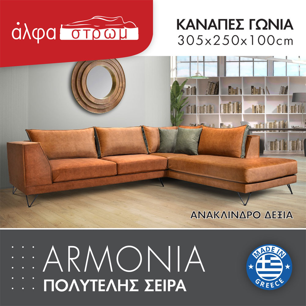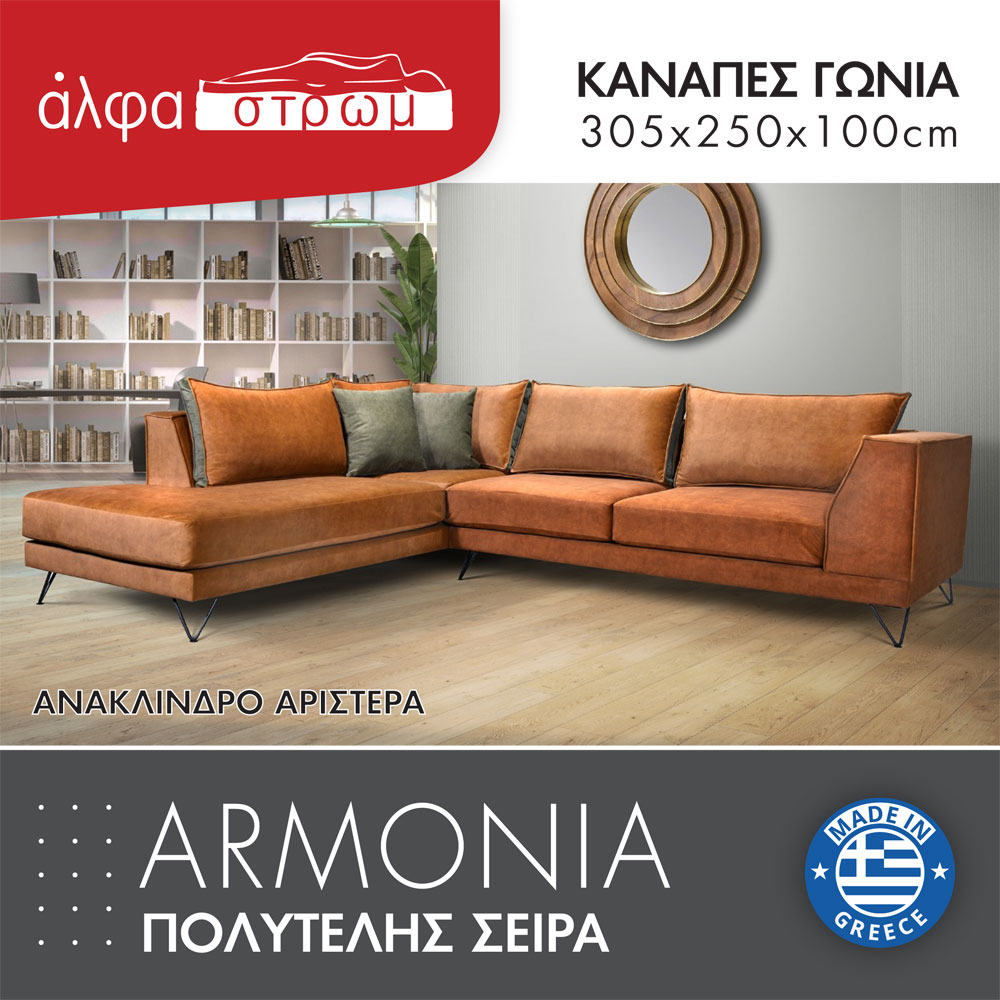 Ένας μοντέρνος γωνιακός καναπές με εξώγαζα. Επιλέγετε εξαρχής πού επιθυμείτε να είναι το ανάκλινδρο (αριστερά ή δεξιά - όπως φαίνεται στις φωτογραφίες). Είναι ελληνικής κατασκευής και επιλέγετε τα υφάσματα της αρεσκείας σας καθώς και το χρώμα των ποδιών. Τα χρώματα των υφασμάτων μπορεί να διαφέρουν ελαφρώς από την εικόνα. Υπάρχει η δυνατότητα να γίνει σε άλλες διαστάσεις με έξτρα χρέωση (επικοινωνήστε μαζί μας για τέτοια παραγγελία).
