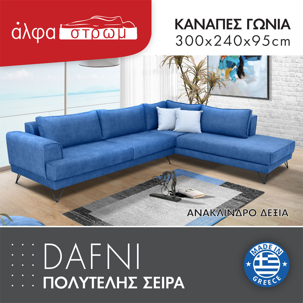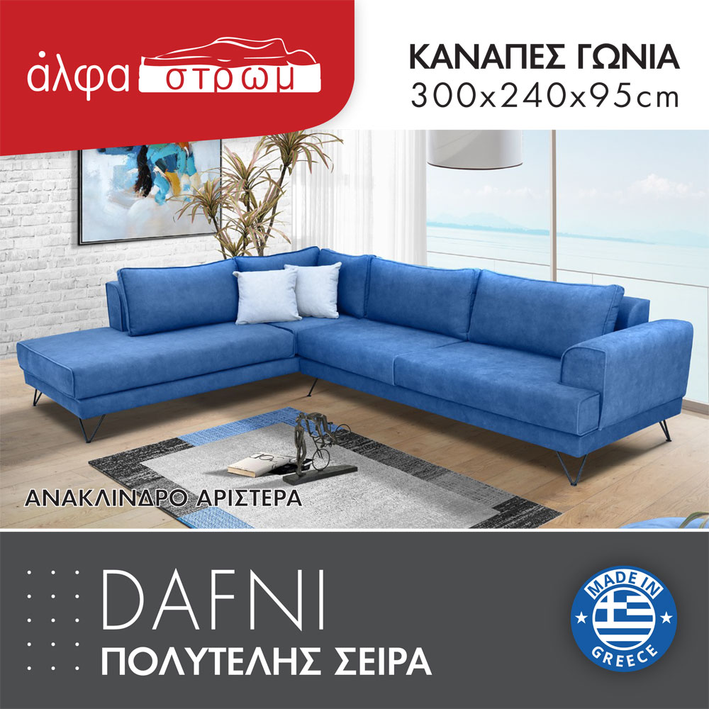 Ένας μοντέρνος γωνιακός καναπές με καμπύλες στην πλάτη, καμπυλωμένο μπράτσο και διακοσμητικά ρέλια. Επιλέγετε εξαρχής πού επιθυμείτε να είναι το ανάκλινδρο (αριστερά ή δεξιά - όπως φαίνεται στις φωτογραφίες). Είναι ελληνικής κατασκευής και επιλέγετε τα υφάσματα της αρεσκείας σας καθώς και το χρώμα των ποδιών. Τα χρώματα των υφασμάτων μπορεί να διαφέρουν ελαφρώς από την εικόνα. Υπάρχει η δυνατότητα να γίνει σε άλλες διαστάσεις με έξτρα χρέωση (επικοινωνήστε μαζί μας για τέτοια παραγγελία).