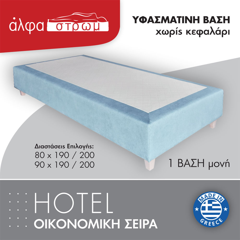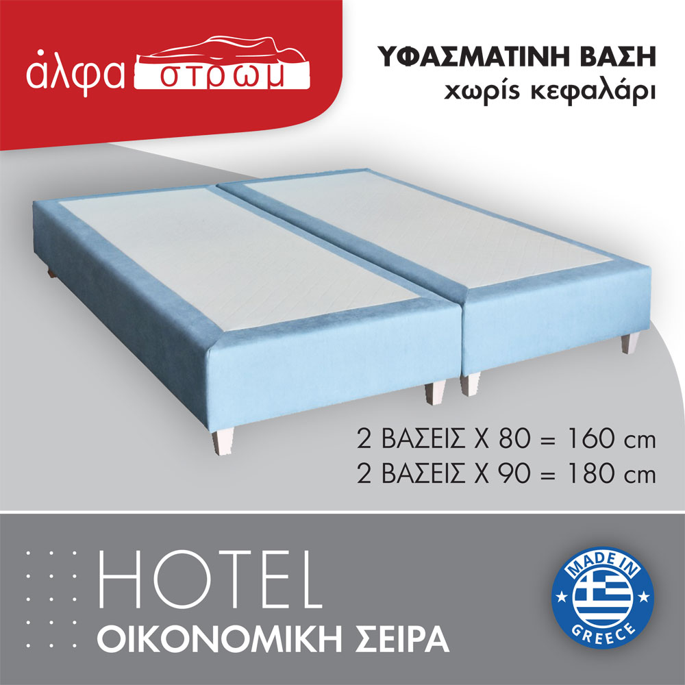 Μια υφασμάτινη βάση κρεβατιού χωρίς κεφαλάρι κατάλληλη για ξενοδοχεία ή και για χρήση στο σπίτι από ενήλικες και παιδιά. Είναι ελληνικής κατασκευής και επιλέγετε το ύφασμα της αρεσκείας σας. Τα χρώματα των υφασμάτων μπορεί να διαφέρουν ελαφρώς από την εικόνα. Επιλέγετε αν θα είναι μονή ή 2 βάσεις δίπλα-δίπλα που σχηματίζουν υπέρδιπλη διάσταση.