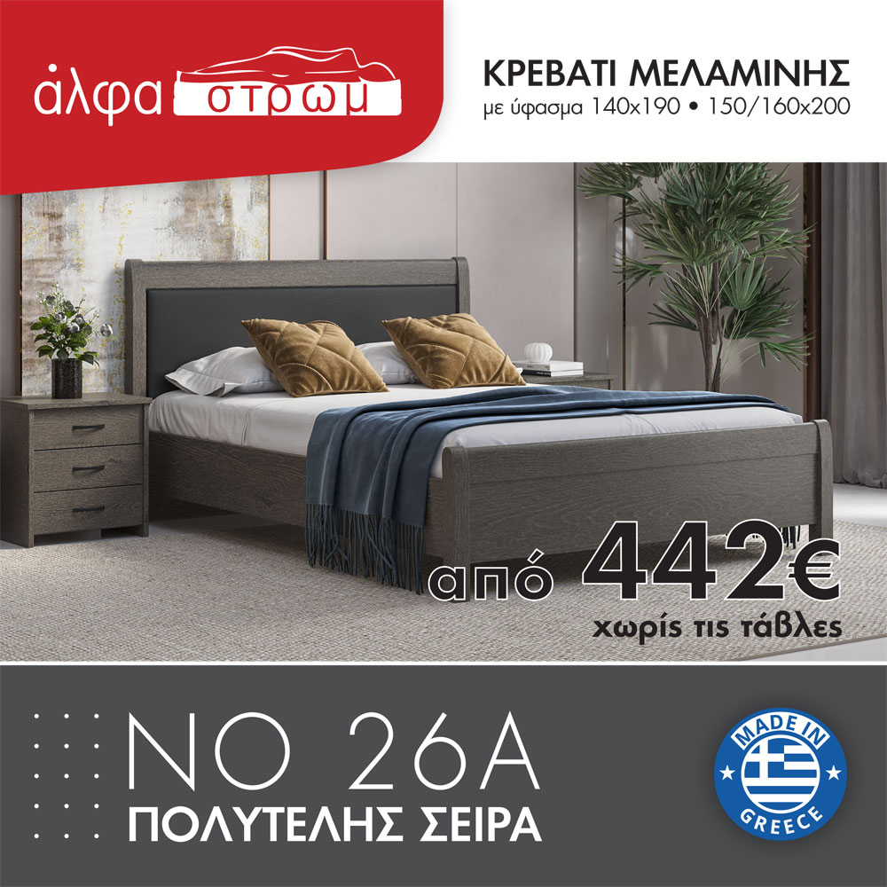 Ένα στιβαρό κρεβάτι με συνδυασμό υφάσματος στο κεφαλάρι. Είναι ελληνικής κατασκευής και επιλέγετε το ύφασμα της αρεσκείας σας για να το συνδυάσετε με το χρώμα μελαμίνης. Τα χρώματα των ξύλων και των υφασμάτων μπορεί να διαφέρουν ελαφρώς από την εικόνα. Υπάρχει η δυνατότητα να γίνει κλειστό κουτί που "πατάει" στο πάτωμα (μπαούλο) με έξτρα χρέωση. Επίσης, γίνεται κατασκευή με αποθηκευτικό χώρο με χρήση ανατομικού τελάρου και μηχανισμού ανύψωσης, με έξτρα χρέωση.