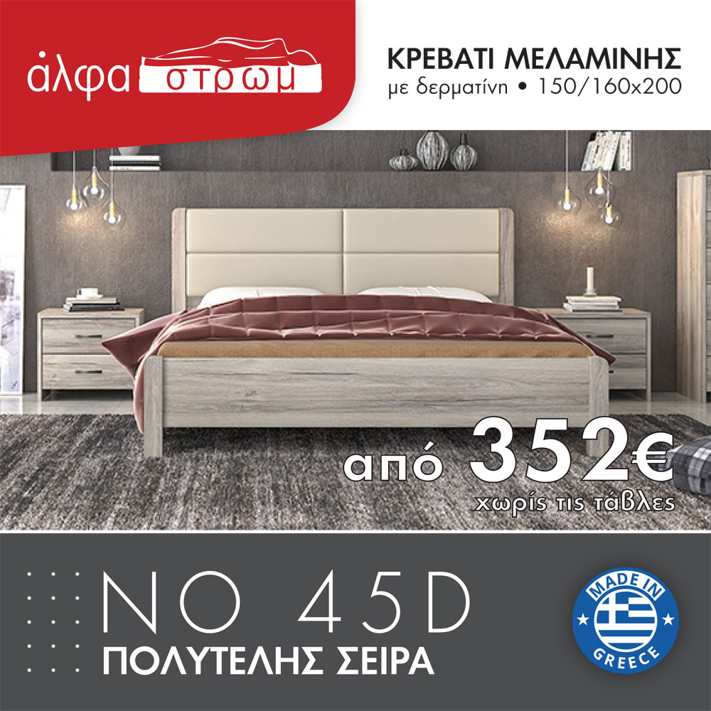 Ένα στιβαρό κρεβάτι μελαμίνης σε συνδυασμό με μπεζ δερματίνη στο κεφαλάρι. Είναι ελληνικής κατασκευής. Τα χρώματα των ξύλων και των υφασμάτων μπορεί να διαφέρουν ελαφρώς από την εικόνα. Υπάρχει η δυνατότητα να γίνει κλειστό κουτί που "πατάει" στο πάτωμα (μπαούλο) με έξτρα χρέωση. Επίσης, γίνεται κατασκευή με αποθηκευτικό χώρο με χρήση ανατομικού τελάρου και μηχανισμού ανύψωσης, με έξτρα χρέωση.
