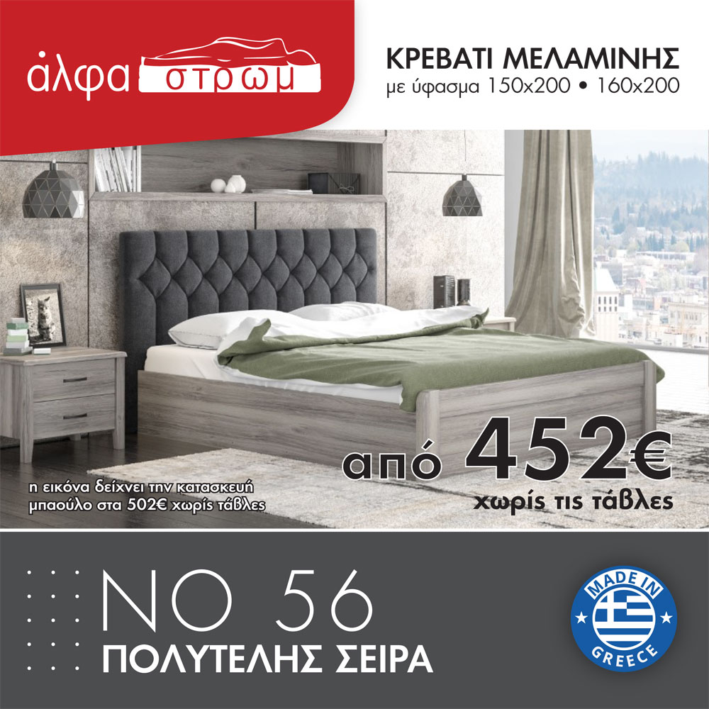 Ένα στιβαρό κρεβάτι με υφασμάτινο κεφαλάρι. Είναι ελληνικής κατασκευής και επιλέγετε το ύφασμα της αρεσκείας σας για να το συνδυάσετε με το χρώμα μελαμίνης. Τα χρώματα των ξύλων και των υφασμάτων μπορεί να διαφέρουν ελαφρώς από την εικόνα. Υπάρχει η δυνατότητα να γίνει κλειστό κουτί που "πατάει" στο πάτωμα (μπαούλο) με έξτρα χρέωση - όπως φαίνεται στην εικόνα. Επίσης, γίνεται κατασκευή με αποθηκευτικό χώρο με χρήση ανατομικού τελάρου και μηχανισμού ανύψωσης, με έξτρα χρέωση.