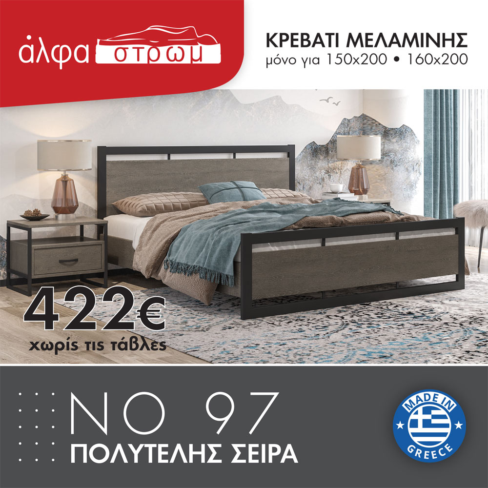 Ένα στιβαρό κρεβάτι με μεικτή κατασκευή μετάλλου και μελαμίνης. Είναι ελληνικής κατασκευής και βγαίνει μονόχρωμο. Τα χρώματα των ξύλων και των υφασμάτων μπορεί να διαφέρουν ελαφρώς από την εικόνα. Δεν γίνεται κουτί (μπαούλο) και δεν βγαίνει με αποθηκευτικό χώρο.