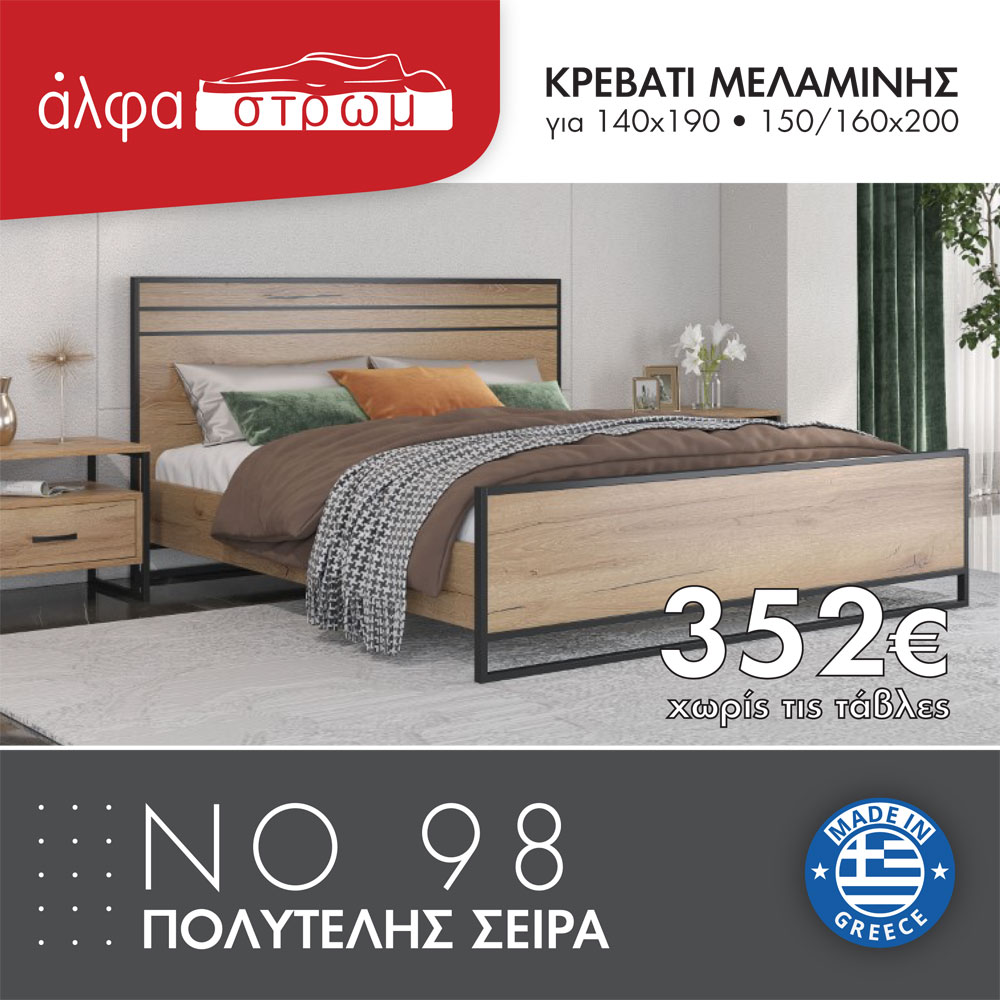 Ένα στιβαρό κρεβάτι που κατασκευάζεται με συνδυασμό μελαμίνης και μετάλλου. Είναι ελληνικής κατασκευής και βγαίνει μονόχρωμο. Τα χρώματα των ξύλων και των υφασμάτων μπορεί να διαφέρουν ελαφρώς από την εικόνα. Δεν γίνεται κουτί (μπαούλο) και δεν βγαίνει με αποθηκευτικό χώρο.